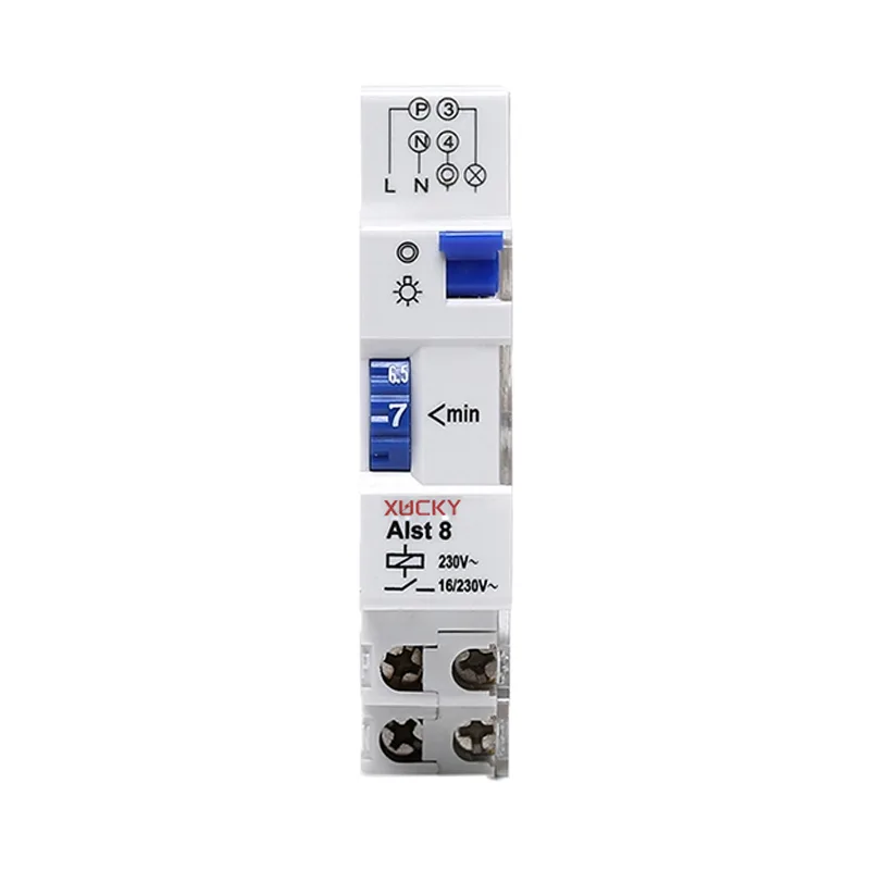 Temporizador de interruptor de luz automático de alta qualidade XUCKY, um interruptor de tempo de escada ALST8 está disponível em trilho DIN. Tem autonomia de 1 minuto a 7 minutos e é equipado com proteção eletrônica contra sobrecarga.