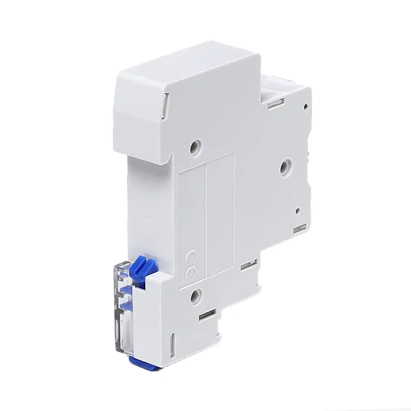 1.Projetado para fácil instalação na caixa de distribuição elétrica, basta prender o temporizador no corrimão e pressionar até ouvir um "clique". Para remover, puxe para baixo a trava localizada na parte inferior do temporizador para liberar.