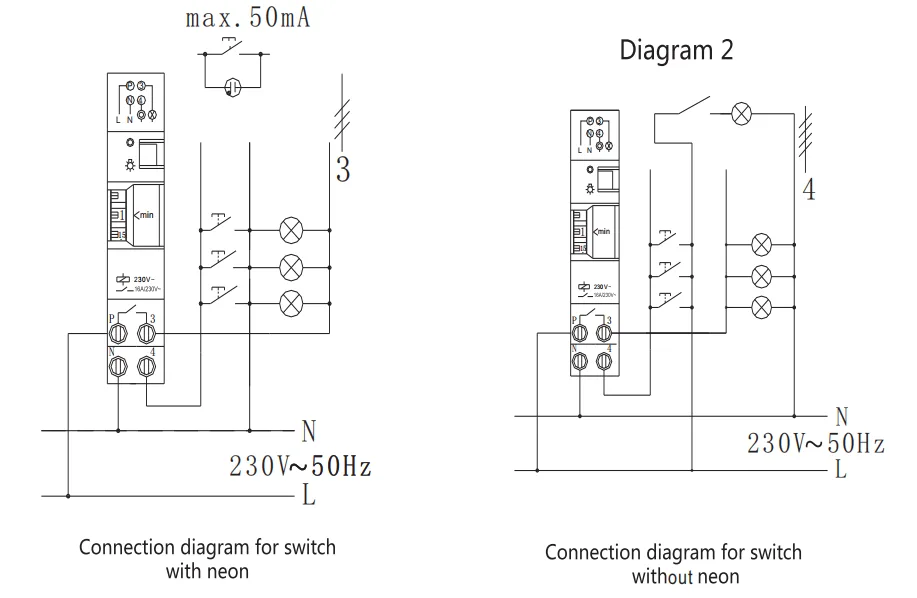 a.Conecte os fios conforme indicado no Diagrama 1 para interruptor com néon e no Diagrama 2 para interruptor sem néon.