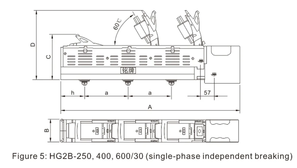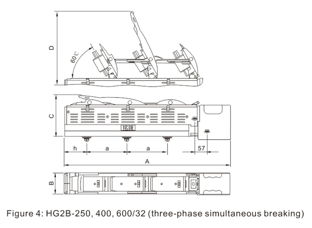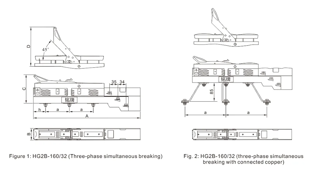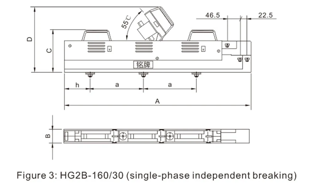 Dimensões gerais e de instalação do seccionador de fusível em linha HG2B-160 ~ 630A.